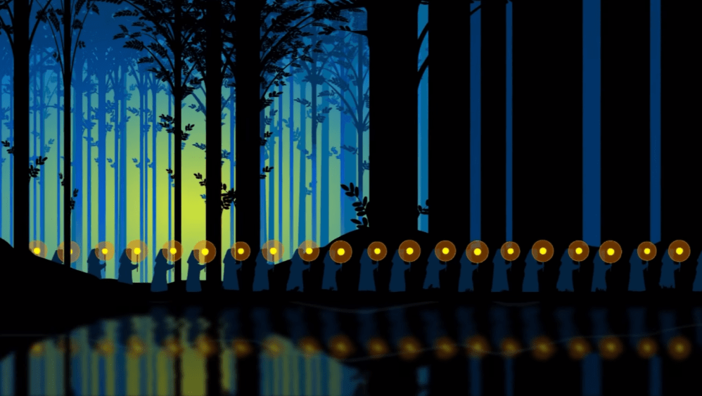 Beatrice sobbalzò e indicò con il ditino un punto immerso nell’oscurità del paesaggio. Una lunga processione di sudari bianchi splendenti di luce propria stava percorrendo il sentiero tra gli alberi. L’andamento era maestoso.